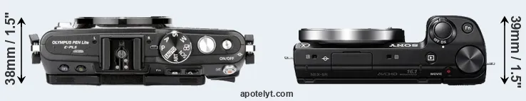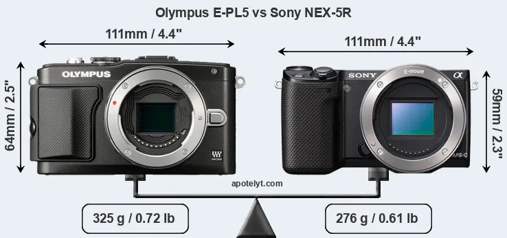 The physical size and weight of the Olympus E-PL5 and the Sony NEX-5R are illustrated in the side-by-side display below. The two cameras are presented according to their relative size. Three successive views from the front, the top, and the rear are shown. All size dimensions are rounded to the nearest millimeter.