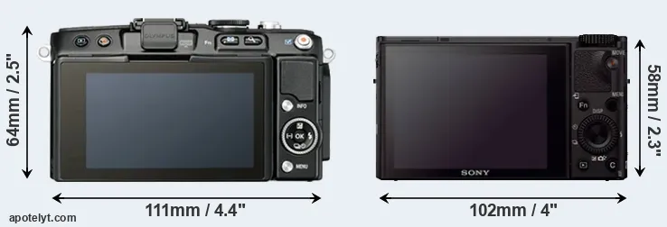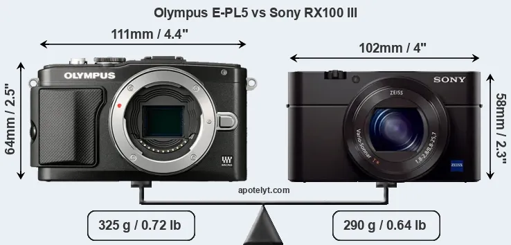 The side-by-side display below illustrates the physical size and weight of the Olympus E-PL5 and the Sony RX100 III. The two cameras are presented according to their relative size. Three consecutive perspectives from the front, the top, and the back are available. All width, height and depth measures are rounded to the nearest millimeter.