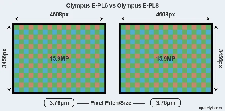 The two cameras under review do not only share the same sensor size, but also offer an identical resolution of 15.9 megapixels. This similarity in sensor specs implies that both the E-PL6 and the E-PL8 have the same pixel density, as well as the same pixel size. It should, however, be noted that the E-PL8 is much more recent (by 3 years and 4 months) than the E-PL6, and its sensor will have benefitted from technological advances during this time.