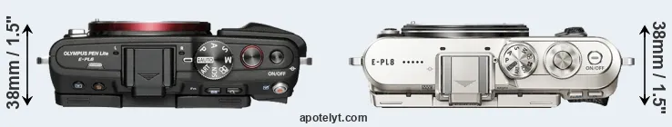 The side-by-side display below illustrates the physical size and weight of the Olympus E-PL6 and the Olympus E-PL8. The two cameras are presented according to their relative size. Three consecutive views from the front, the top, and the rear side are shown. All width, height and depth dimensions are rounded to the nearest millimeter.