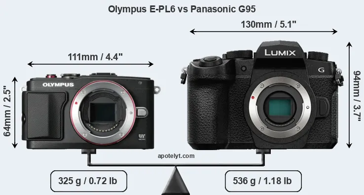 If the front view area (width x height) of the cameras is taken as an aggregate measure of their size, the Panasonic G95 is considerably larger (72 percent) than the Olympus E-PL6. Moreover, the G95 is substantially heavier (65 percent) than the E-PL6. It is noteworthy in this context that the G95 is splash and dust-proof, while the E-PL6 does not feature any corresponding weather-sealing.