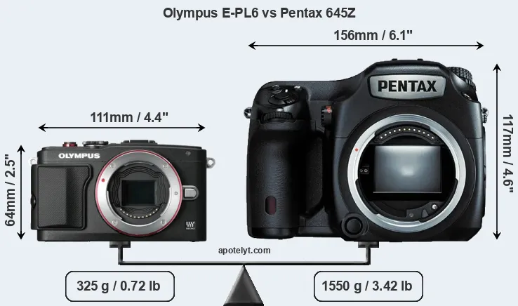 If the front view area (width x height) of the cameras is taken as an aggregate measure of their size, the Pentax 645Z is considerably larger (157 percent) than the Olympus E-PL6. Moreover, the 645Z is substantially heavier (377 percent) than the E-PL6. It is noteworthy in this context that the 645Z is splash and dust-proof, while the E-PL6 does not feature any corresponding weather-sealing.