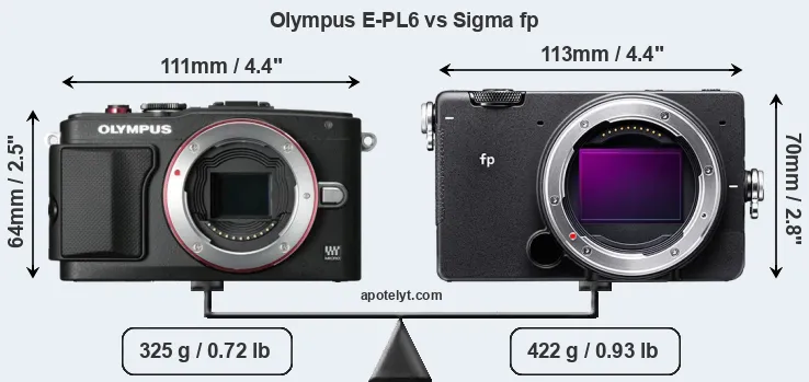 If the front view area (width x height) of the cameras is taken as an aggregate measure of their size, the Sigma fp is notably larger (11 percent) than the Olympus E-PL6. Moreover, the fp is markedly heavier (30 percent) than the E-PL6. It is noteworthy in this context that the fp is splash and dust-proof, while the E-PL6 does not feature any corresponding weather-sealing.