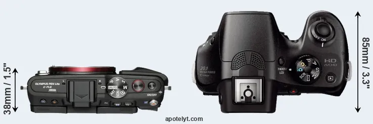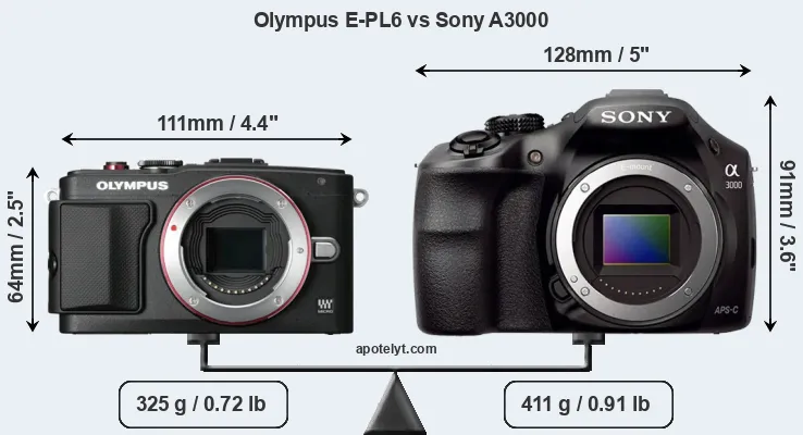 The side-by-side display below illustrates the physical size and weight of the Olympus E-PL6 and the Sony A3000. The two cameras are presented according to their relative size. Three successive views from the front, the top, and the rear are shown. All width, height and depth measures are rounded to the nearest millimeter.