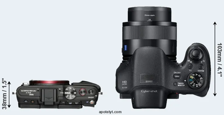 The side-by-side display below illustrates the physical size and weight of the Olympus E-PL6 and the Sony HX350. The two cameras are presented according to their relative size. Three successive views from the front, the top, and the rear are shown. All width, height and depth measures are rounded to the nearest millimeter.