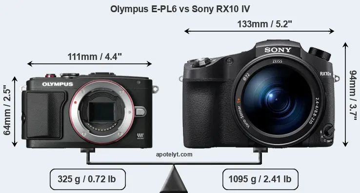 An illustration of the physical size and weight of the Olympus E-PL6 and the Sony RX10 IV is provided in the side-by-side display below. The two cameras are presented according to their relative size. Three consecutive perspectives from the front, the top, and the back are available. All width, height and depth dimensions are rounded to the nearest millimeter.