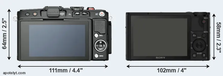 The side-by-side display below illustrates the physical size and weight of the Olympus E-PL6 and the Sony RX100. The two cameras are presented according to their relative size. Three consecutive views from the front, the top, and the rear side are shown. All width, height and depth dimensions are rounded to the nearest millimeter.