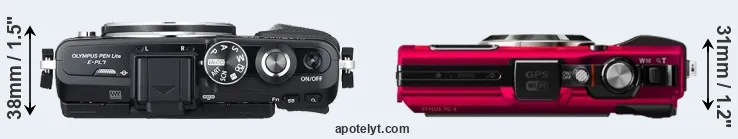 The side-by-side display below illustrates the physical size and weight of the Olympus E-PL7 and the Olympus TG-4. The two cameras are presented according to their relative size. Three consecutive views from the front, the top, and the rear side are shown. All width, height and depth dimensions are rounded to the nearest millimeter.