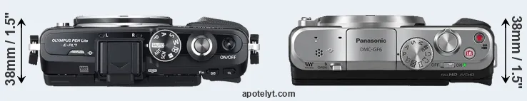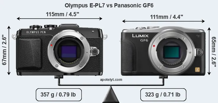 The side-by-side display below illustrates the physical size and weight of the Olympus E-PL7 and the Panasonic GF6. The two cameras are presented according to their relative size. Three consecutive views from the front, the top, and the rear side are shown. All width, height and depth dimensions are rounded to the nearest millimeter.