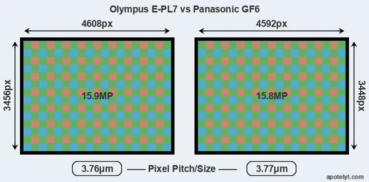 While the two cameras under review share the same sensor size, the E-PL7 offers a slightly higher resolution of 15.9 megapixels, compared with 15.8 MP of the GF6. This megapixels advantage translates into a 0.3 percent gain in linear resolution. On the other hand, these sensor specs imply that the E-PL7 has a higher pixel density and a smaller size of the individual pixel (with a pixel pitch of 3.76μm versus 3.77μm for the GF6). In this context, it should be noted, however, that the E-PL7 is a somewhat more recent model (by 1 year and 4 months) than the GF6, and its sensor might have benefitted from technological advances during this time that at least partly compensate for the smaller pixel size.