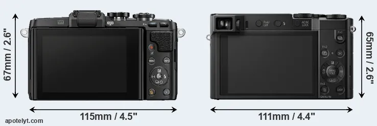 The side-by-side display below illustrates the physical size and weight of the Olympus E-PL7 and the Panasonic TZ100. The two cameras are presented according to their relative size. Three successive views from the front, the top, and the rear are shown. All width, height and depth measures are rounded to the nearest millimeter.