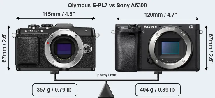 The side-by-side display below illustrates the physical size and weight of the Olympus E-PL7 and the Sony A6300. The two cameras are presented according to their relative size. Three consecutive views from the front, the top, and the rear side are shown. All width, height and depth measures are rounded to the nearest millimeter.