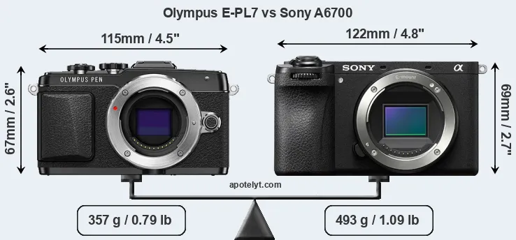 If the front view area (width x height) of the cameras is taken as an aggregate measure of their size, the Sony A6700 is notably larger (9 percent) than the Olympus E-PL7. Moreover, the A6700 is substantially heavier (38 percent) than the E-PL7. It is noteworthy in this context that the A6700 is splash and dust-proof, while the E-PL7 does not feature any corresponding weather-sealing.