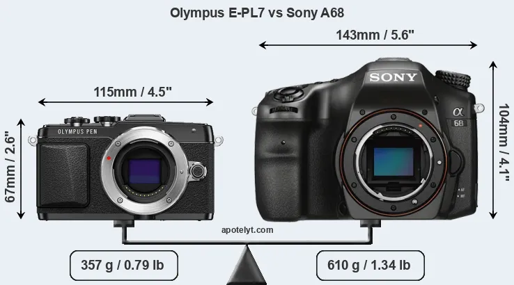 If the front view area (width x height) of the cameras is taken as an aggregate measure of their size, the Sony A68 is considerably larger (93 percent) than the Olympus E-PL7. Moreover, the A68 is substantially heavier (71 percent) than the E-PL7. In this context, it is worth noting that neither the E-PL7 nor the A68 are weather-sealed.