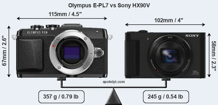 The physical size and weight of the Olympus E-PL7 and the Sony HX90V are illustrated in the side-by-side display below. The two cameras are presented according to their relative size. Three consecutive perspectives from the front, the top, and the back are available. All width, height and depth dimensions are rounded to the nearest millimeter.