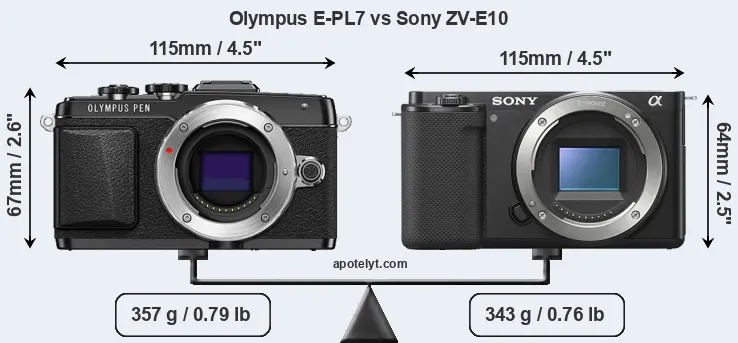 The side-by-side display below illustrates the physical size and weight of the Olympus E-PL7 and the Sony ZV-E10. The two cameras are presented according to their relative size. Three consecutive perspectives from the front, the top, and the back are available. All width, height and depth measures are rounded to the nearest millimeter.