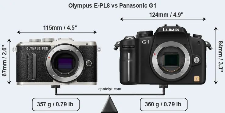 The side-by-side display below illustrates the physical size and weight of the Olympus E-PL8 and the Panasonic G1. The two cameras are presented according to their relative size. Three consecutive perspectives from the front, the top, and the back are available. All width, height and depth dimensions are rounded to the nearest millimeter.