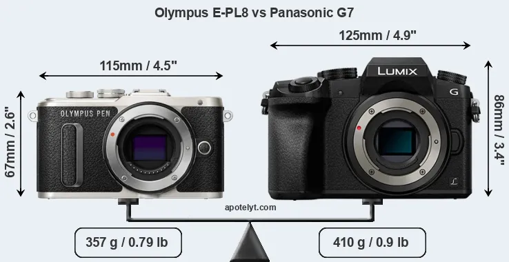 The physical size and weight of the Olympus E-PL8 and the Panasonic G7 are illustrated in the side-by-side display below. The two cameras are presented according to their relative size. Three consecutive perspectives from the front, the top, and the back are available. All width, height and depth dimensions are rounded to the nearest millimeter.