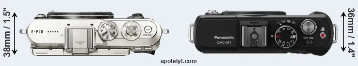 The side-by-side display below illustrates the physical size and weight of the Olympus E-PL8 and the Panasonic GF1. The two cameras are presented according to their relative size. Three successive views from the front, the top, and the rear are shown. All width, height and depth measures are rounded to the nearest millimeter.