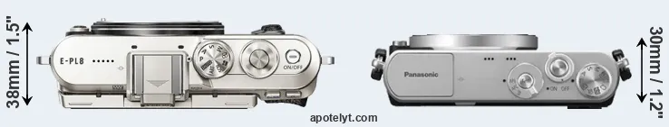 The physical size and weight of the Olympus E-PL8 and the Panasonic GM1 are illustrated in the side-by-side display below. The two cameras are presented according to their relative size. Three consecutive perspectives from the front, the top, and the back are available. All size dimensions are rounded to the nearest millimeter.