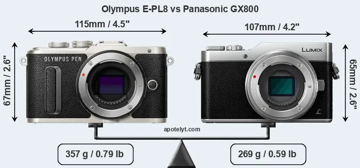 The physical size and weight of the Olympus E-PL8 and the Panasonic GX800 are illustrated in the side-by-side display below. The two cameras are presented according to their relative size. Three successive views from the front, the top, and the rear are shown. All width, height and depth dimensions are rounded to the nearest millimeter.
