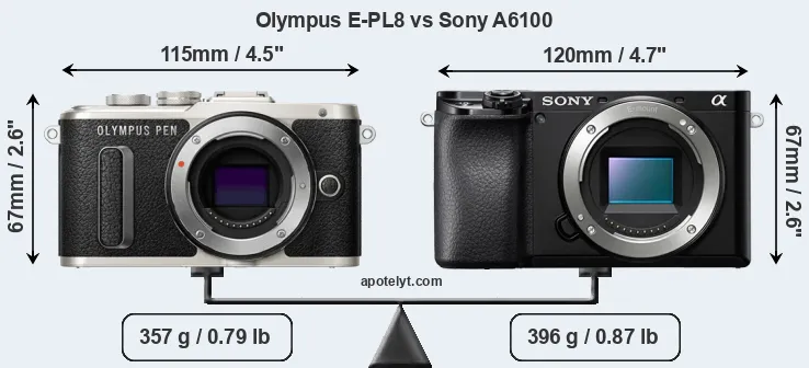 If the front view area (width x height) of the cameras is taken as an aggregate measure of their size, the Sony A6100 is somewhat larger (4 percent) than the Olympus E-PL8. Moreover, the A6100 is markedly heavier (11 percent) than the E-PL8. In this context, it is worth noting that neither the E-PL8 nor the A6100 are weather-sealed.