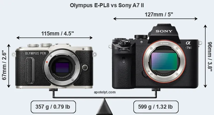 If the front view area (width x height) of the cameras is taken as an aggregate measure of their size, the Sony A7 II is considerably larger (58 percent) than the Olympus E-PL8. Moreover, the A7 II is substantially heavier (68 percent) than the E-PL8. It is noteworthy in this context that the A7 II is splash and dust-proof, while the E-PL8 does not feature any corresponding weather-sealing.