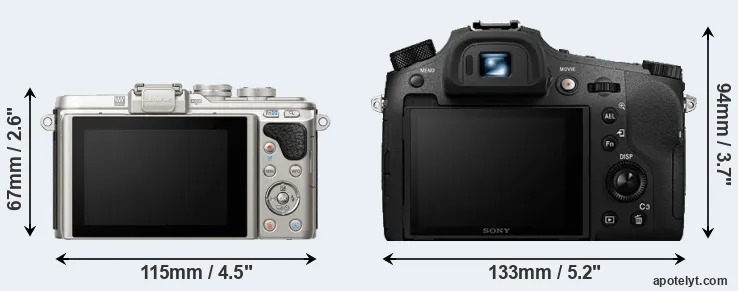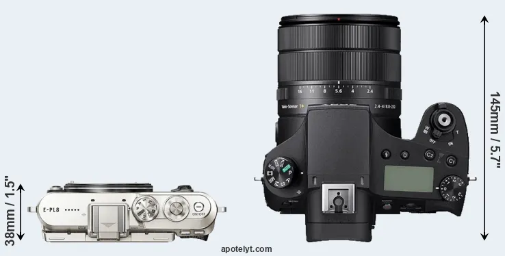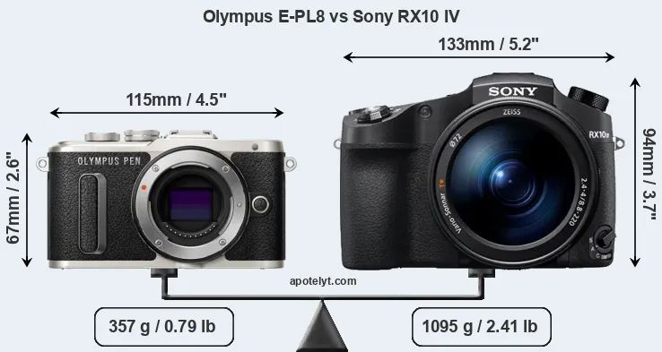 The side-by-side display below illustrates the physical size and weight of the Olympus E-PL8 and the Sony RX10 IV. The two cameras are presented according to their relative size. Three consecutive perspectives from the front, the top, and the back are available. All width, height and depth dimensions are rounded to the nearest millimeter.