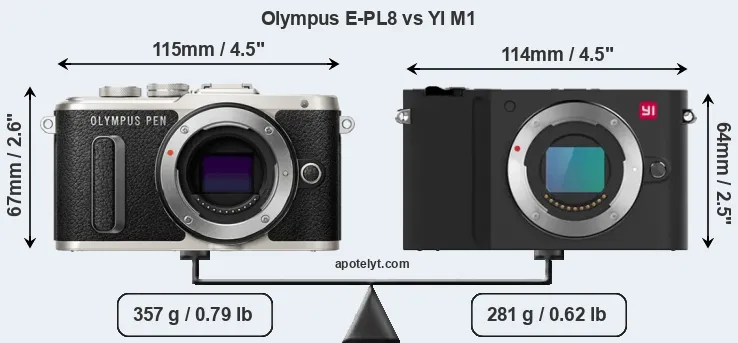 The side-by-side display below illustrates the physical size and weight of the Olympus E-PL8 and the YI M1. The two cameras are presented according to their relative size. Three consecutive perspectives from the front, the top, and the back are available. All width, height and depth measures are rounded to the nearest millimeter.