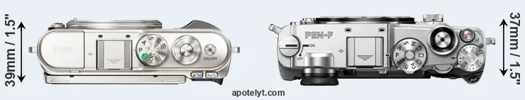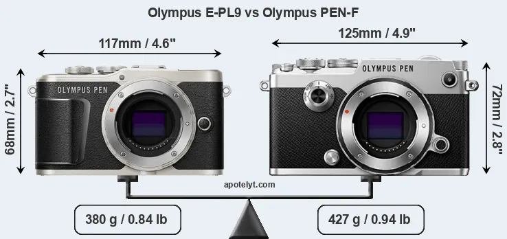 The physical size and weight of the Olympus E-PL9 and the Olympus PEN-F are illustrated in the side-by-side display below. The two cameras are presented according to their relative size. Three consecutive perspectives from the front, the top, and the back are available. All width, height and depth measures are rounded to the nearest millimeter.