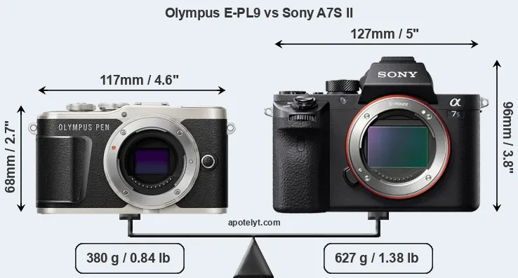 If the front view area (width x height) of the cameras is taken as an aggregate measure of their size, the Sony A7S II is considerably larger (53 percent) than the Olympus E-PL9. Moreover, the A7S II is substantially heavier (65 percent) than the E-PL9. It is noteworthy in this context that the A7S II is splash and dust-proof, while the E-PL9 does not feature any corresponding weather-sealing.