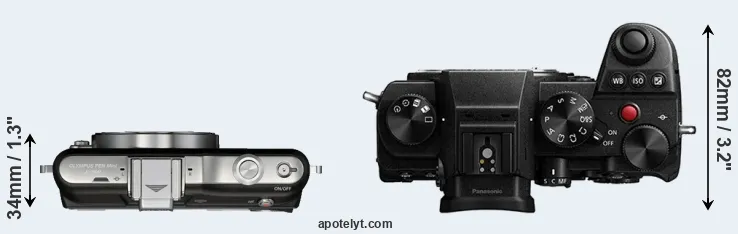 The side-by-side display below illustrates the physical size and weight of the Olympus E-PM1 and the Panasonic S5. The two cameras are presented according to their relative size. Three consecutive views from the front, the top, and the rear side are shown. All width, height and depth measures are rounded to the nearest millimeter.