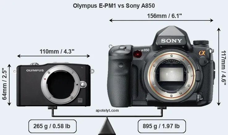 If the front view area (width x height) of the cameras is taken as an aggregate measure of their size, the Sony A850 is considerably larger (159 percent) than the Olympus E-PM1. Moreover, the A850 is substantially heavier (238 percent) than the E-PM1. It is noteworthy in this context that the A850 is splash and dust-proof, while the E-PM1 does not feature any corresponding weather-sealing.