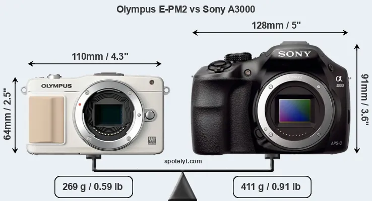 If the front view area (width x height) of the cameras is taken as an aggregate measure of their size, the Sony A3000 is considerably larger (65 percent) than the Olympus E-PM2. Moreover, the A3000 is substantially heavier (53 percent) than the E-PM2. In this context, it is worth noting that neither the E-PM2 nor the A3000 are weather-sealed.