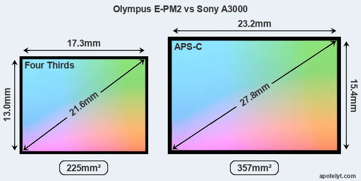 Of the two cameras under consideration, the Olympus E-PM2 features a Four Thirds sensor and the Sony A3000 an APS-C sensor. The sensor area in the A3000 is 59 percent bigger. As a result of these sensor size differences, the cameras have a format factor of, respectively, 2.0 and 1.5. The sensor in the E-PM2 has a native 4:3 aspect ratio, while the one in the A3000 offers a 3:2 aspect.