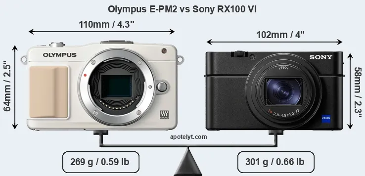 The side-by-side display below illustrates the physical size and weight of the Olympus E-PM2 and the Sony RX100 VI. The two cameras are presented according to their relative size. Three successive views from the front, the top, and the rear are shown. All size dimensions are rounded to the nearest millimeter.