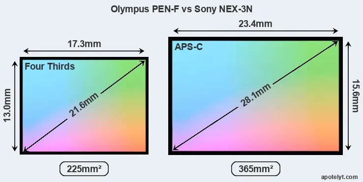 Of the two cameras under consideration, the Olympus PEN-F features a Four Thirds sensor and the Sony NEX-3N an APS-C sensor. The sensor area in the NEX-3N is 62 percent bigger. As a result of these sensor size differences, the cameras have a format factor of, respectively, 2.0 and 1.5. The sensor in the PEN-F has a native 4:3 aspect ratio, while the one in the NEX-3N offers a 3:2 aspect.