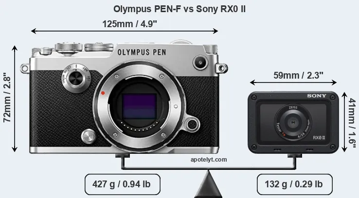 If the front view area (width x height) of the cameras is taken as an aggregate measure of their size, the Sony RX0 II is considerably smaller (73 percent) than the Olympus PEN-F. It is noteworthy in this context that the RX0 II is splash and dust-proof, while the PEN-F does not feature any corresponding weather-sealing. More than that, the RX0 II is water-proof up to 10m and can, thus, be used for underwater photography.