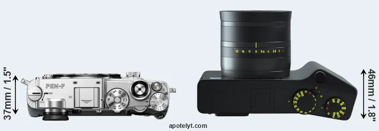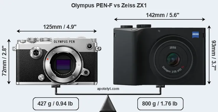 If the front view area (width x height) of the cameras is taken as an aggregate measure of their size, the Zeiss ZX1 is considerably larger (47 percent) than the Olympus PEN-F. In this context, it is worth noting that neither the PEN-F nor the ZX1 are weather-sealed.