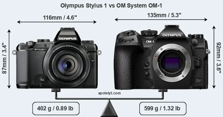 If the front view area (width x height) of the cameras is taken as an aggregate measure of their size, the OM System OM-1 is notably larger (23 percent) than the Olympus Stylus 1. It is noteworthy in this context that the OM-1 is splash and dust-proof, while the Stylus 1 does not feature any corresponding weather-sealing.