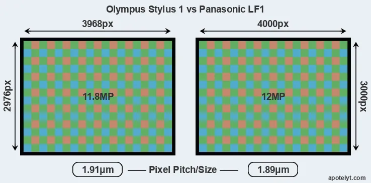 While the two cameras under review share the same sensor size, the LF1 offers a slightly higher resolution of 12 megapixels, compared with 11.8 MP of the Stylus 1. This megapixels advantage translates into a 0.8 percent gain in linear resolution. On the other hand, these sensor specs imply that the LF1 has a higher pixel density and a smaller size of the individual pixel (with a pixel pitch of 1.89μm versus 1.91μm for the Stylus 1). Moreover, it should be noted, that the Stylus 1 is a somewhat more recent model (by 6 months) than the LF1, and its sensor might have benefitted from technological advances during this time that further enhance the light gathering capacity of individual pixels. Coming back to sensor resolution, it should be mentioned that the Stylus 1 has no anti-alias filter installed, so that it can capture all the detail its sensor resolves.