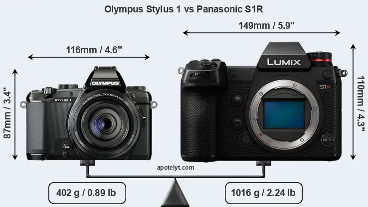 If the front view area (width x height) of the cameras is taken as an aggregate measure of their size, the Panasonic S1R is considerably larger (62 percent) than the Olympus Stylus 1. It is noteworthy in this context that the S1R is splash and dust-proof, while the Stylus 1 does not feature any corresponding weather-sealing.
