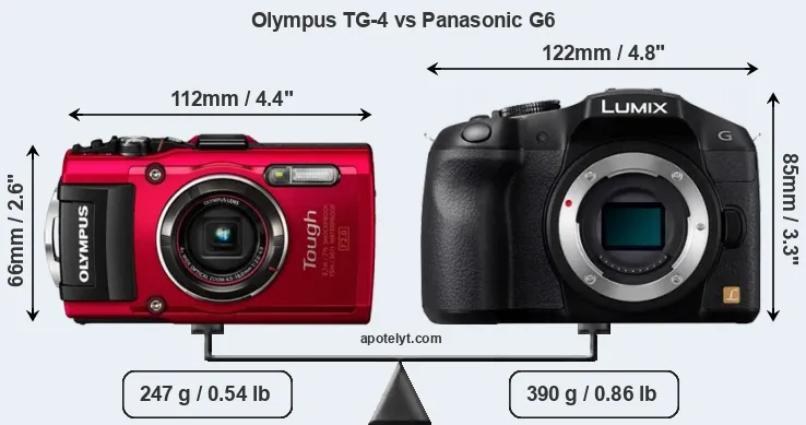 The above size and weight comparisons are to some extent incomplete and possibly misleading, as the TG-4 has a lens built in, whereas the G6 is an interchangeable lens camera that requires a separate lens. Attaching the latter will add extra weight and bulk to the setup. You can compare the optics available for the G6 and their specifications in the Micro Four Thirds Lens Catalog.