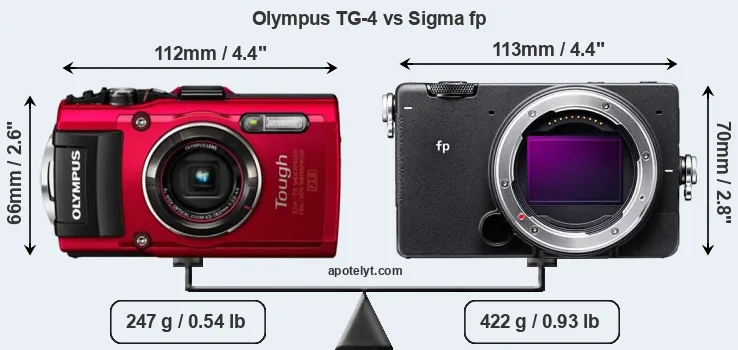 The Olympus Tough TG-4 and the Sigma fp are two digital cameras that were announced, respectively, in April 2015 and July 2019. The TG-4 is a fixed lens compact, while the fp is a mirrorless interchangeable lens camera. The cameras are based on a 1/2.3-inch (TG-4) and a full frame (fp) sensor. The Olympus has a resolution of 15.9 megapixels, whereas the Sigma provides 24 MP.