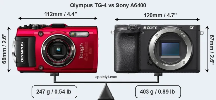An illustration of the physical size and weight of the Olympus TG-4 and the Sony A6400 is provided in the side-by-side display below. The two cameras are presented according to their relative size. Three consecutive views from the front, the top, and the rear side are shown. All width, height and depth dimensions are rounded to the nearest millimeter.