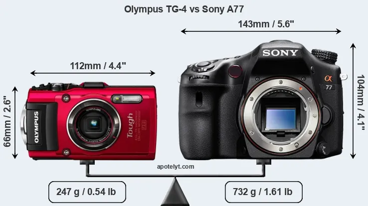The above size and weight comparisons are to some extent incomplete and possibly misleading, as the TG-4 has a lens built in, whereas the A77 is an interchangeable lens camera that requires a separate lens. Attaching the latter will add extra weight and bulk to the setup.