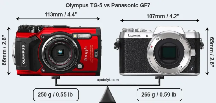 The physical size and weight of the Olympus TG-5 and the Panasonic GF7 are illustrated in the side-by-side display below. The two cameras are presented according to their relative size. Three successive views from the front, the top, and the rear are shown. All width, height and depth dimensions are rounded to the nearest millimeter.