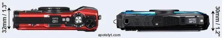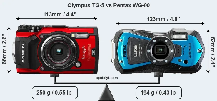 The physical size and weight of the Olympus TG-5 and the Pentax WG-90 are illustrated in the side-by-side display below. The two cameras are presented according to their relative size. Three consecutive views from the front, the top, and the rear side are shown. All width, height and depth dimensions are rounded to the nearest millimeter.