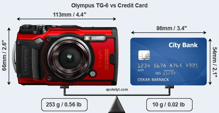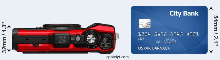 The physical dimensions of the Olympus TG-6 relative to a credit card are illustrated in the side-by-side display below. Three consecutive views from the front, the top, and the rear side are shown. All size dimensions are rounded to the nearest millimeter.
