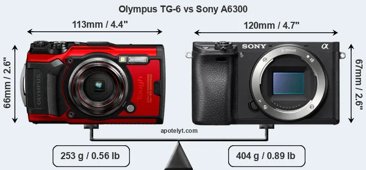The side-by-side display below illustrates the physical size and weight of the Olympus TG-6 and the Sony A6300. The two cameras are presented according to their relative size. Three successive views from the front, the top, and the rear are shown. All size dimensions are rounded to the nearest millimeter.
